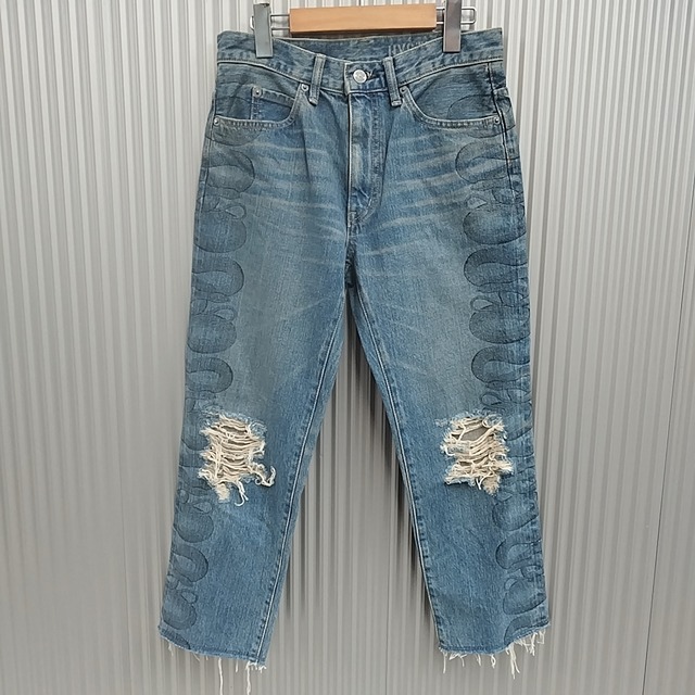 ◆◇ヒステリックグラマーHYSTERIC GLAMOUR◇◆ ★国内正規品 ★日本製 ★定価49500円 ★現在、定価で販売されている現行品です。 ★SNAKE LOOP柄を左右脇にプリントしたクラッシュデニムパンツ。 ★レングスを8分丈でカットオフし、足元をすっきりと見せてくれる。 (「ZOZOTOWN」から引用。) 【状態】 ★10段階中7くらい ★古い物なので薄汚れやクラッシュ部分に多少ほつれがございます。 ★元々のユーズド加工、クラッシュ加工です。 【サイズ】 ★表記25 ★ウエスト37股上28股下60.5腿幅28裾幅18くらい 【素材】 ★綿100% 【カラー】 ★インディゴ