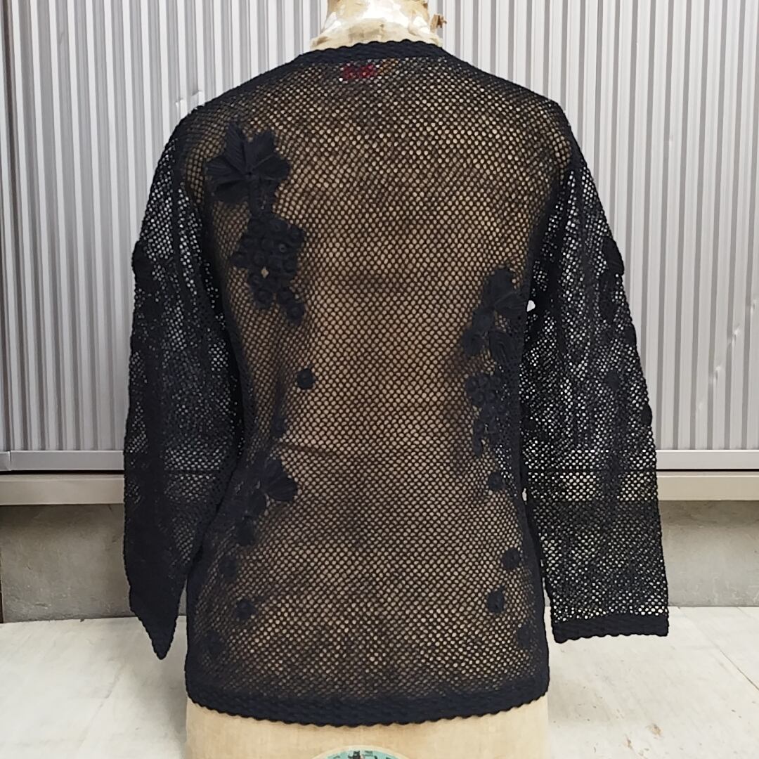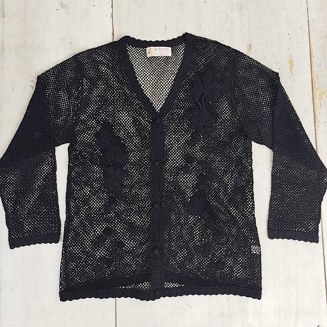 【ハンドメイド/80s/90s】新品/上海/ビンテージ/ヴィンテージ/デッドストック/刺繍デザイン/かぎ針編み/クロシェ/コットン/レース/メッシュ/カーディガン/M/黒/SK23KB5/052/