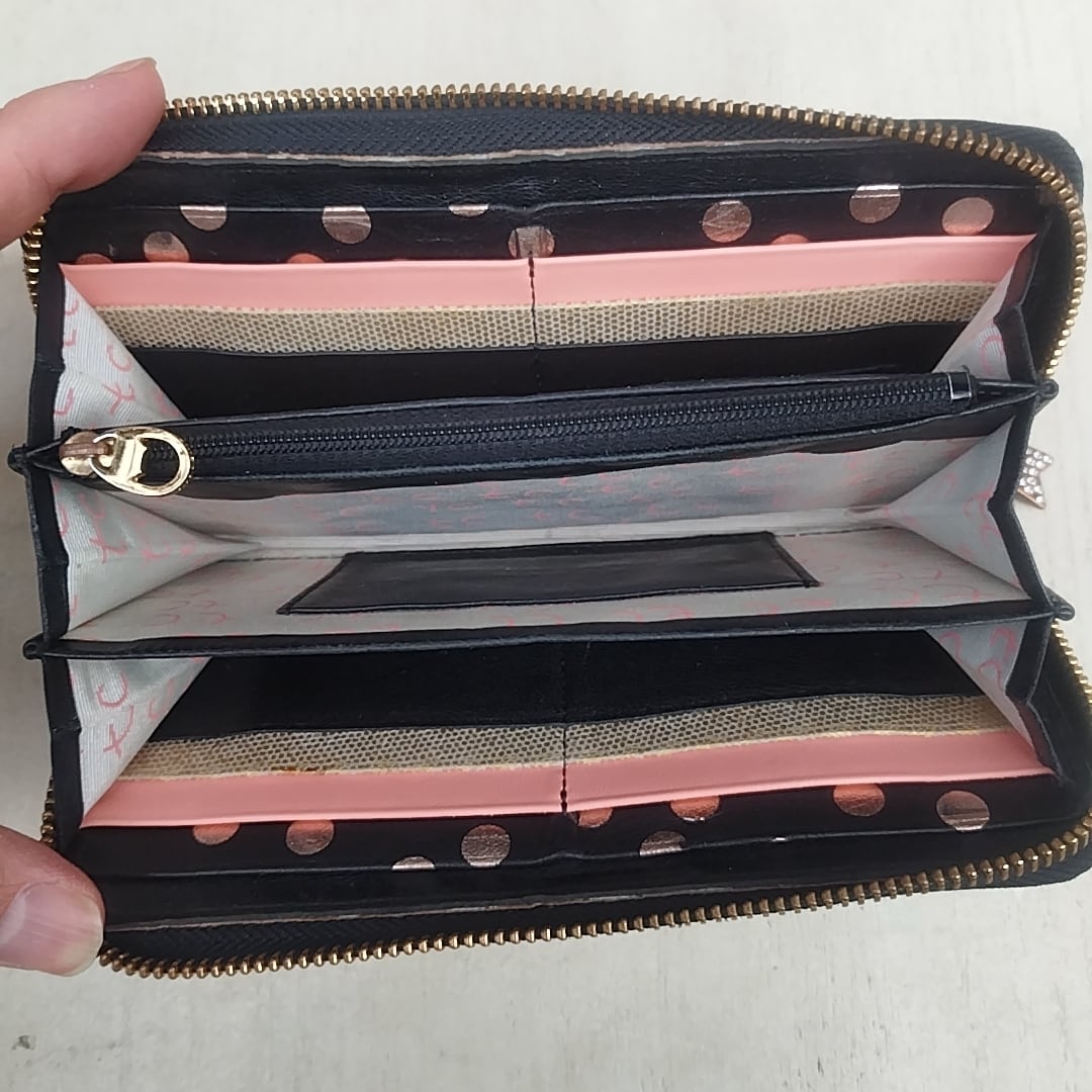 ★古い物なので外側レザー擦れ、内側に汚れ、ファスナートップのラインストーン1つ欠損など使用感がございます。