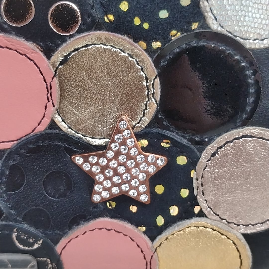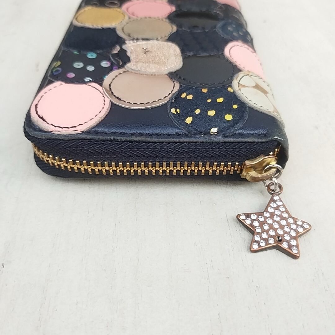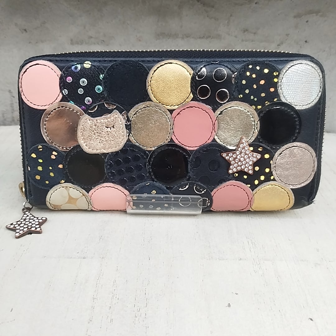 ★エナメル、ドットプリントなどさまざま素材の革を丸く型どり、パッチワークした長財布です。