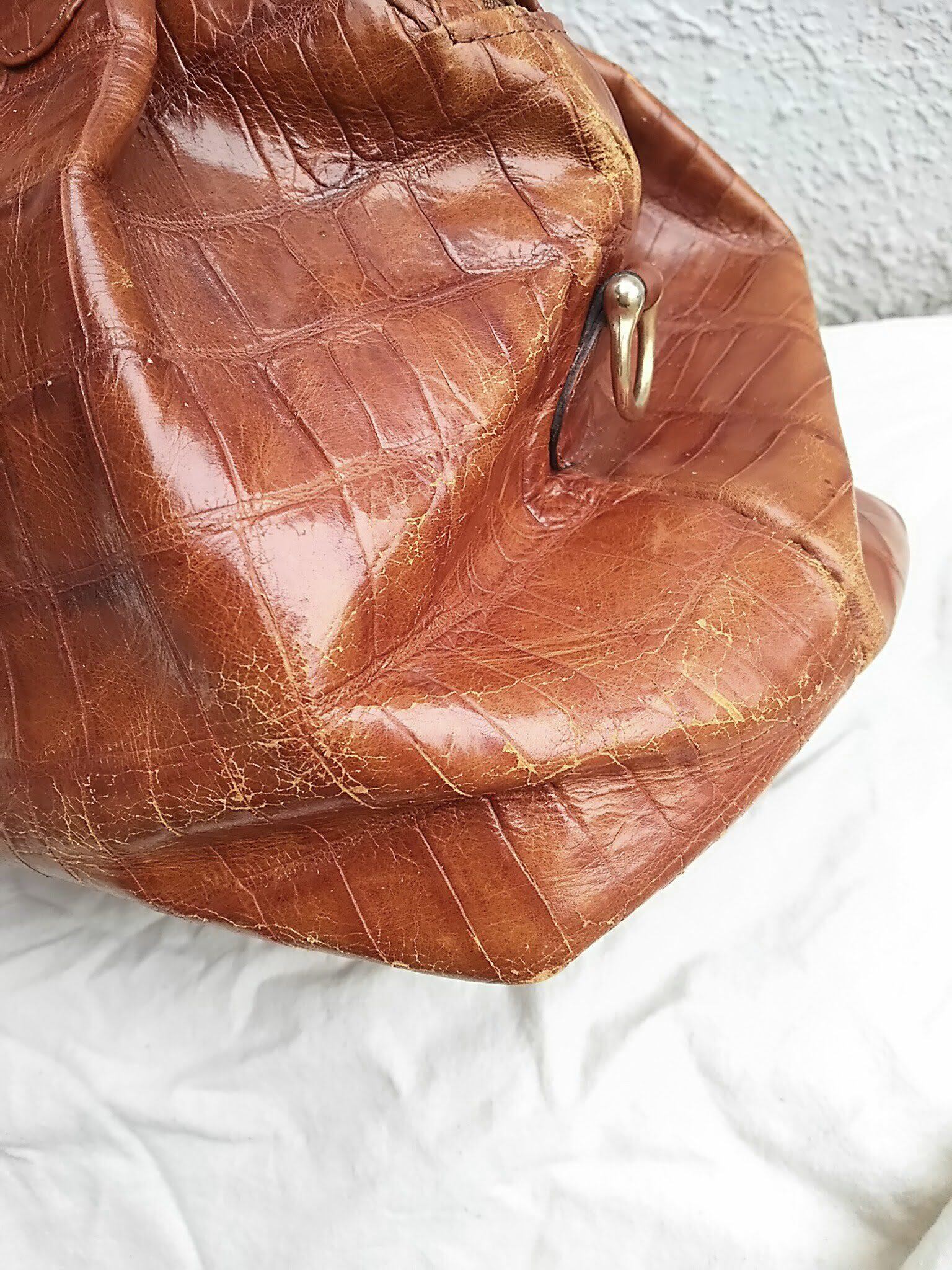 pourvoir/クロコ型押し/エンボス加工/レザー/ボストンバッグ/茶/