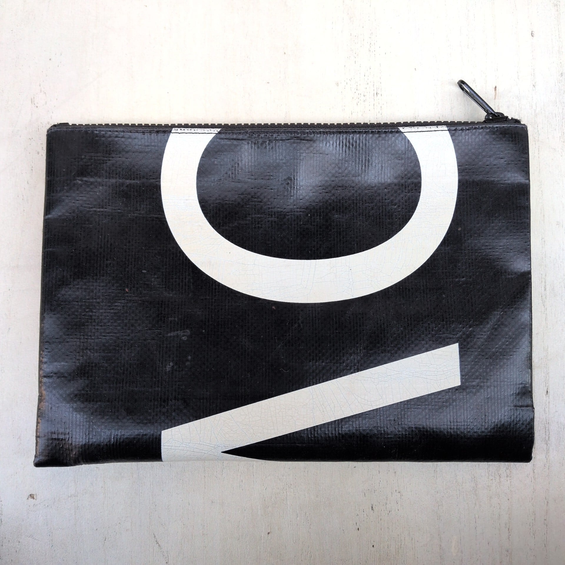 ★唯一無二のリサイクル素材とカラージッパーで構成されるやや大きめのA5サイズポーチ。ポストカード、カードゲーム、香水、はたまたパスポートなどあなたの引き出しの中身を持ち運び出来ます。