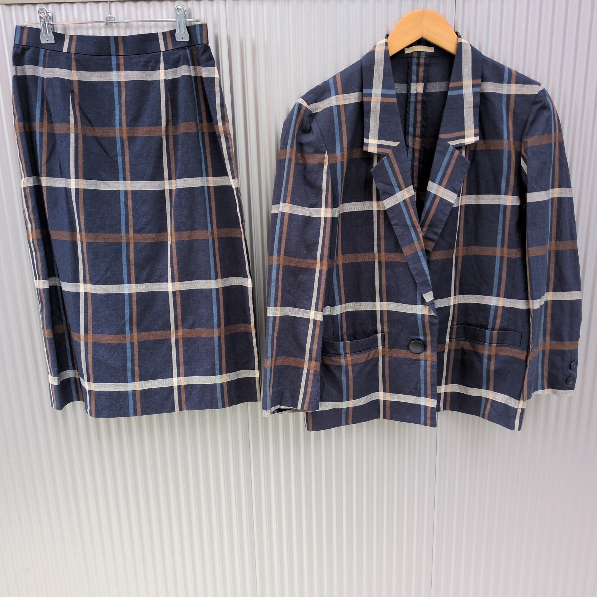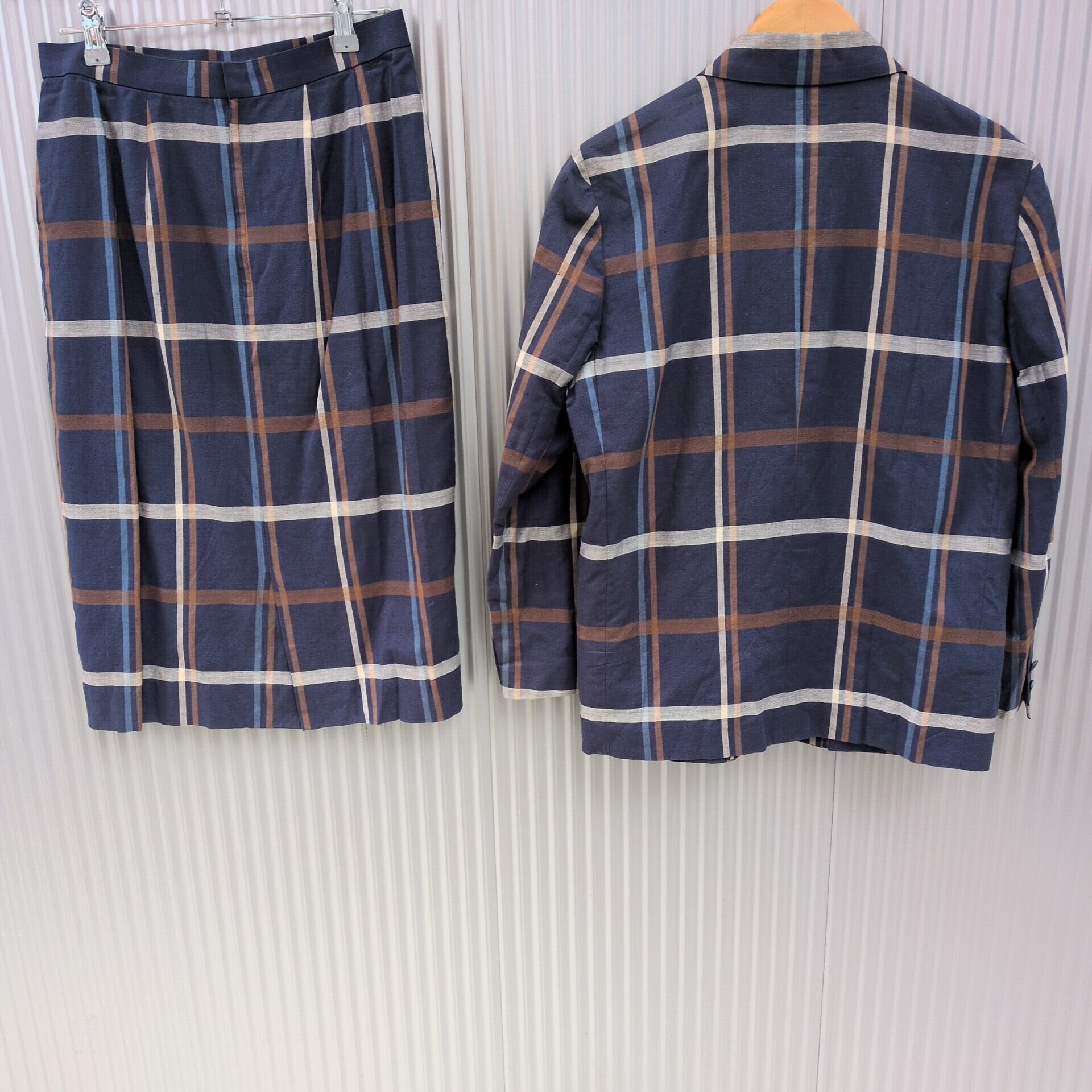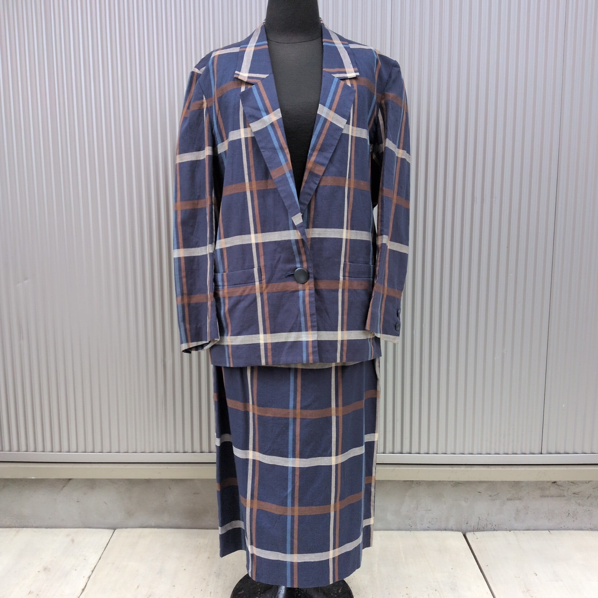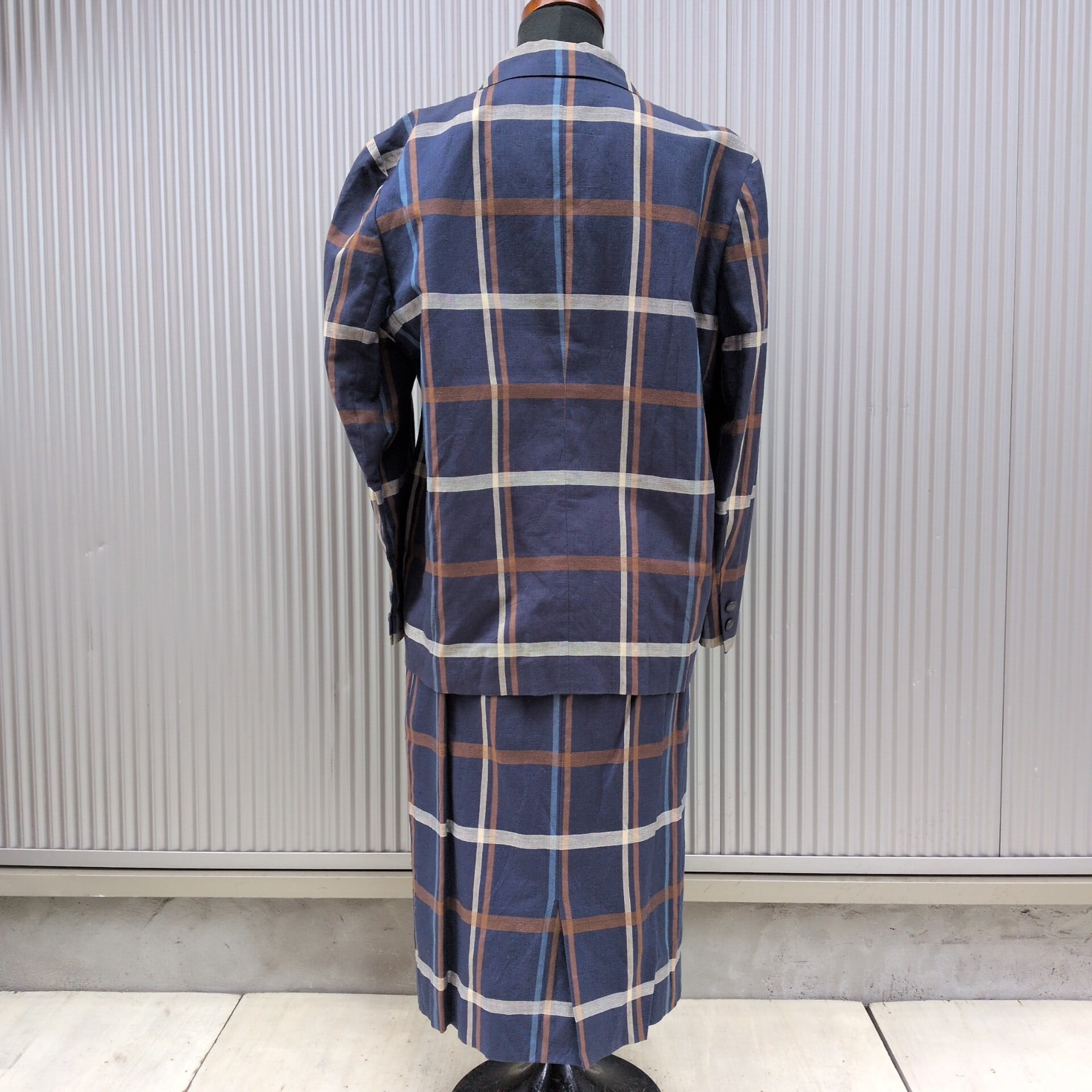 美品/アクアスキュータムAquascutum OF LONDON/ビンテージ/ヴィンテージ/古着/チェック柄/リネンコットン/ジャケット/スカート/スーツ/上下/セットアップ/ネイビー/UC07YR3/002/ | 古着屋RAINBOWFIELD Since 2006