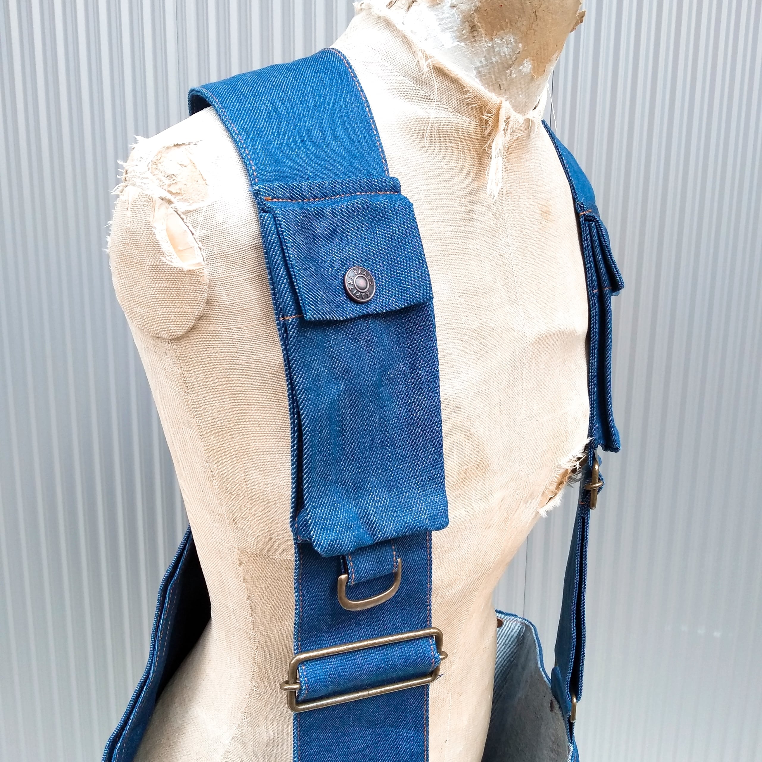 ★釣りの際に使用されるフィッシングベストをモチーフに、デニムで作られたスポーティーなベスト。肩や両サイドのポケットだけでなく、後ろ身頃部分が丸ごと大きなポケットになっています。デザイン性だけでなく、アウトドアウェアのような機能性にも富んだ一枚です。