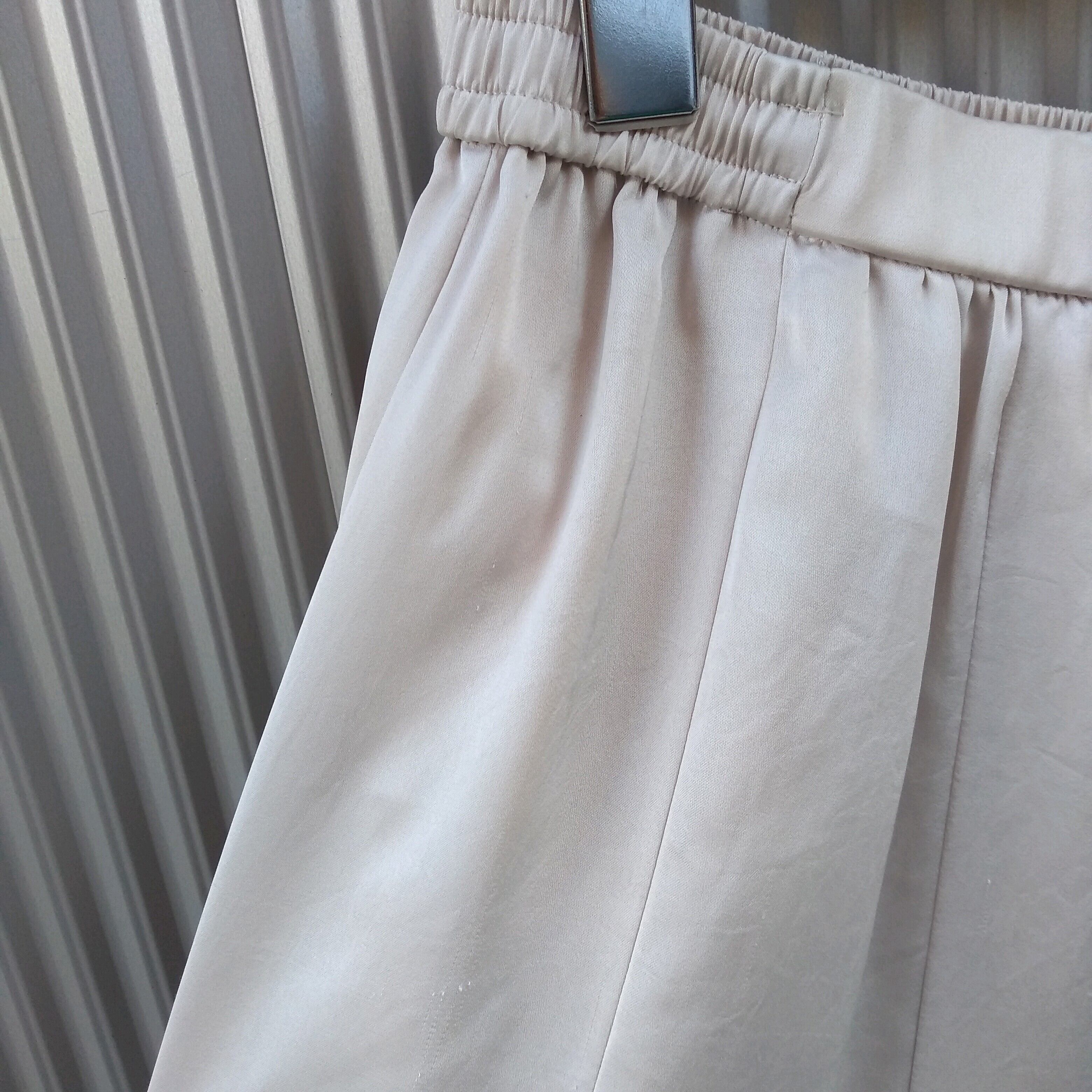 ★途中まで中縫いしたタック10本入り。ウエストからヒップまではすとんと落ちて、動くと分量感の出るシルエット。ウエストはゴム仕様でストレスフリーなはき心地。内側の共紐で、ウエストと丈バランスが調節可能。前身頃ウエスト周りはギャザー少なめでスッキリ見え。全体的にソフトなプレス仕上げで、サテン生地の風合いを楽しめるデザイン。