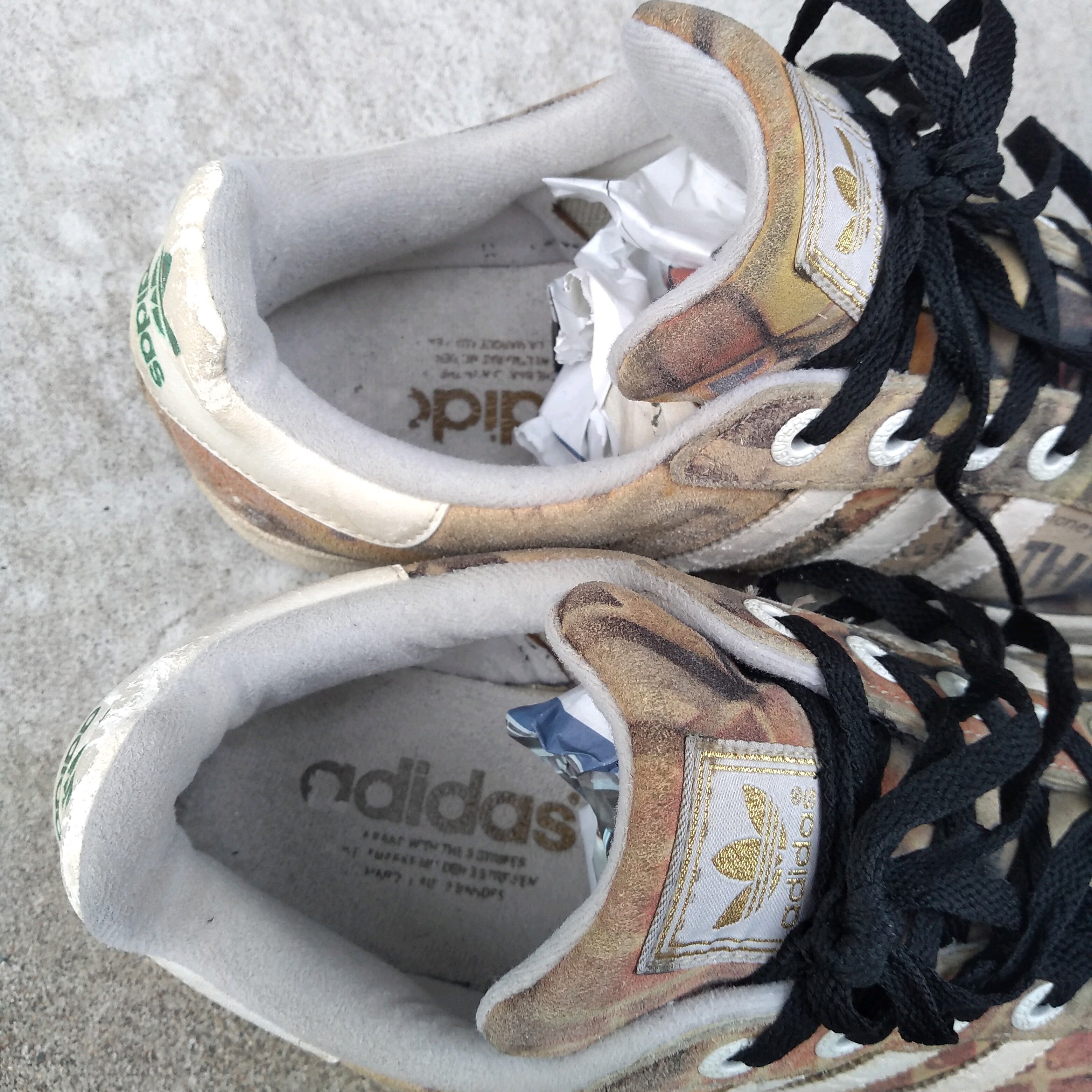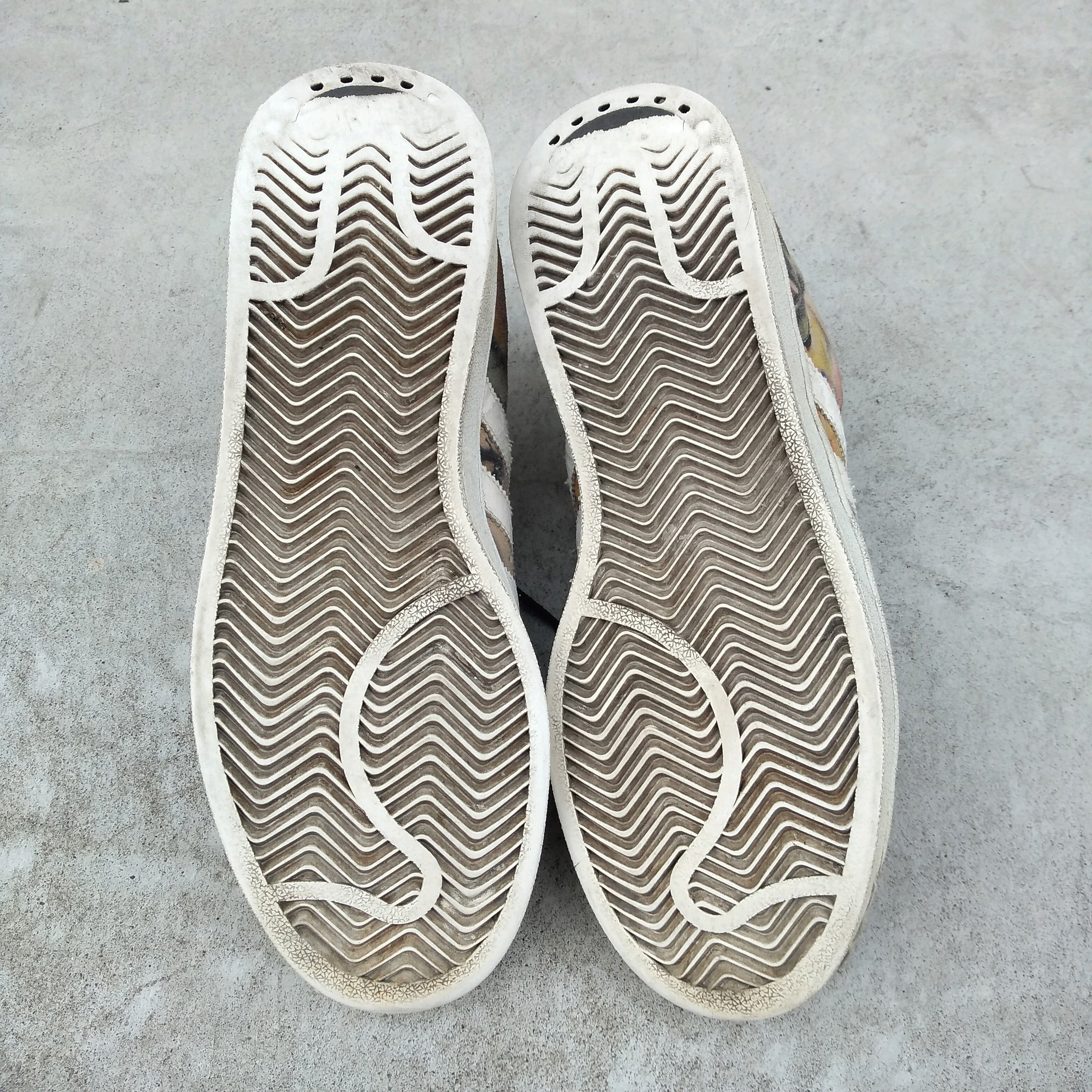 ★古い物なのでソール黄ばみ、汚れ、ソール減り、3本線や後ろのトレフォイル部分などコーティング劣化など使用感あり。