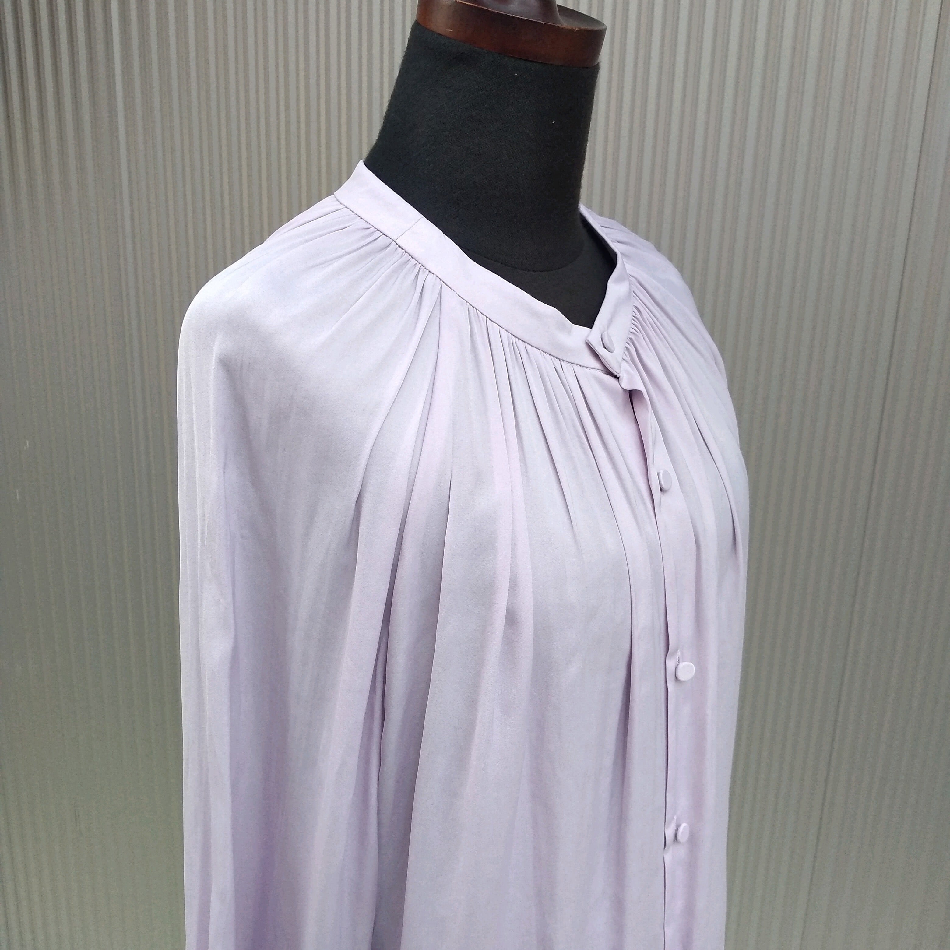 ★前後2WAYで着用可能なデザイン。ヒップが隠れる長めの着丈でカーブしたヘムライン。襟周りにゆとりを持たせたスタンドネック。ネックラインと袖口にたっぷり寄せたギャザーがポイント。くるみボタン開き。