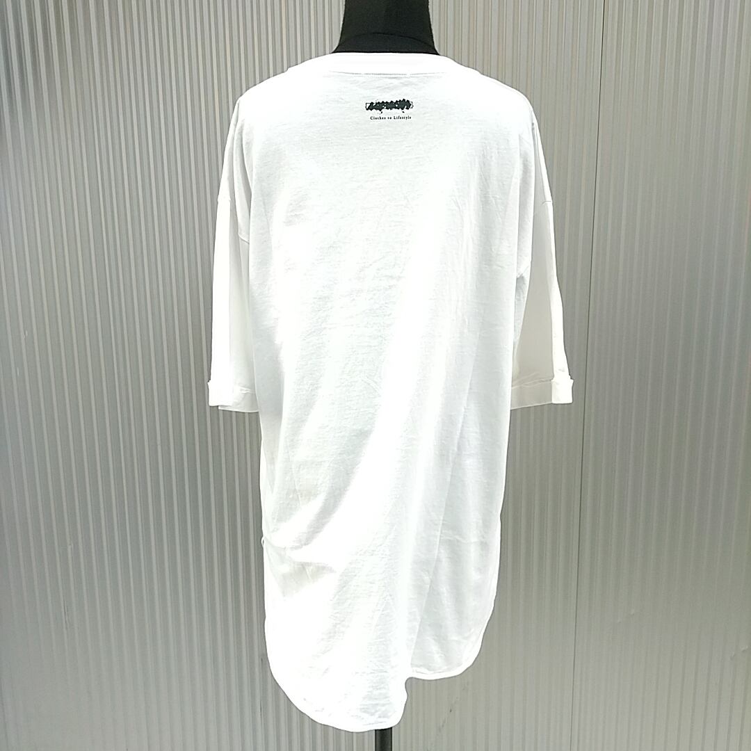 ★コラボレーションロゴプリント。ドロップショルダーでオーバーシルエットの五分袖Tシャツ。後ろ身頃襟下にコラボレーション企画の共通プリント入り。前後差ラウンドテールデザイン。テールも共地テープ仕様で裾がロールしにくい縫製仕様を採用。袖口は折り返しのダブル仕立てのデザイン。