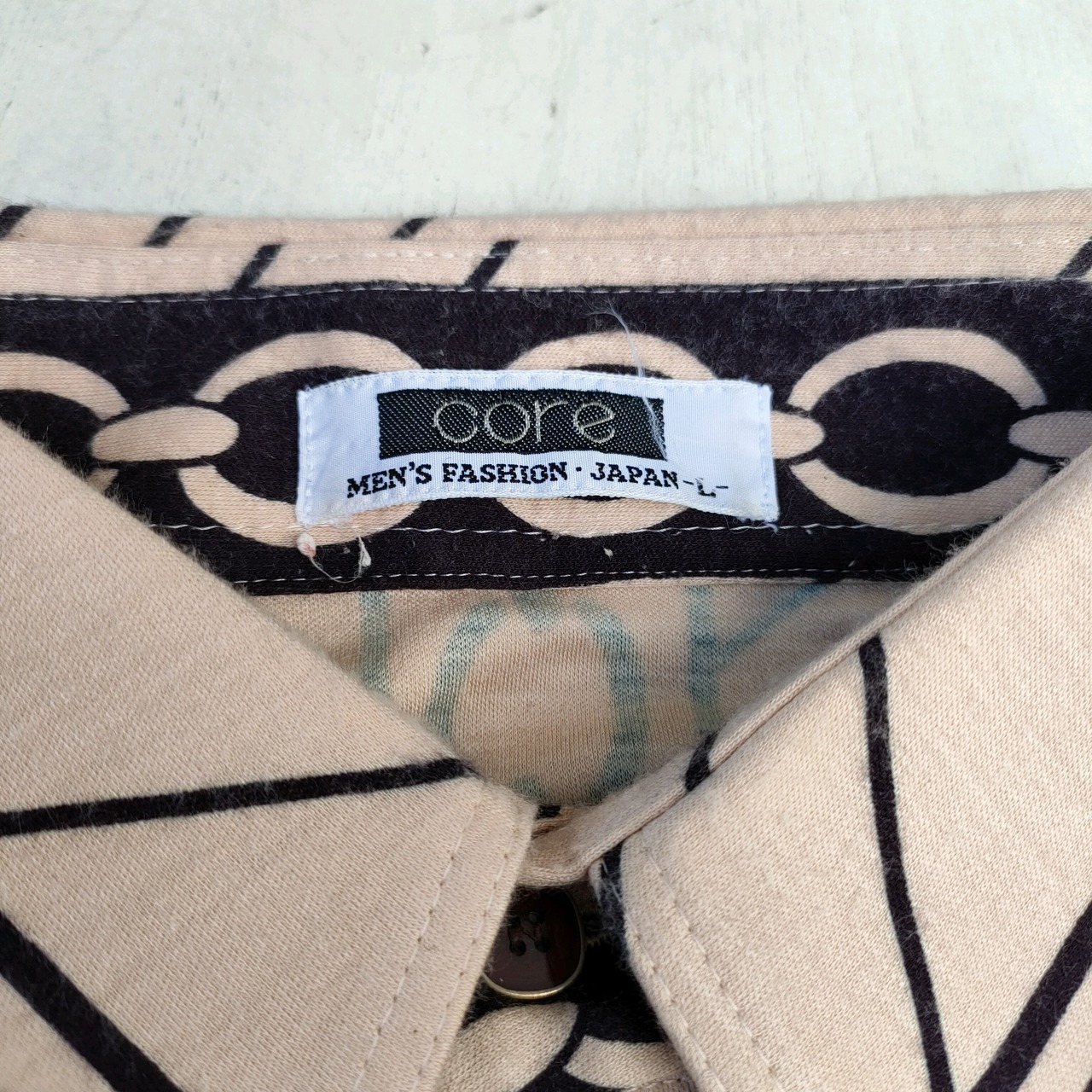 【70s/日本製】コアCORE/ビンテージ/ヴィンテージ/国産古着/レトロ/ビッグシルエット/オーバーサイズ/総柄/チェーン柄/アクリル/プルオーバー/シャツ/L/ベージュ/QB23KS1/