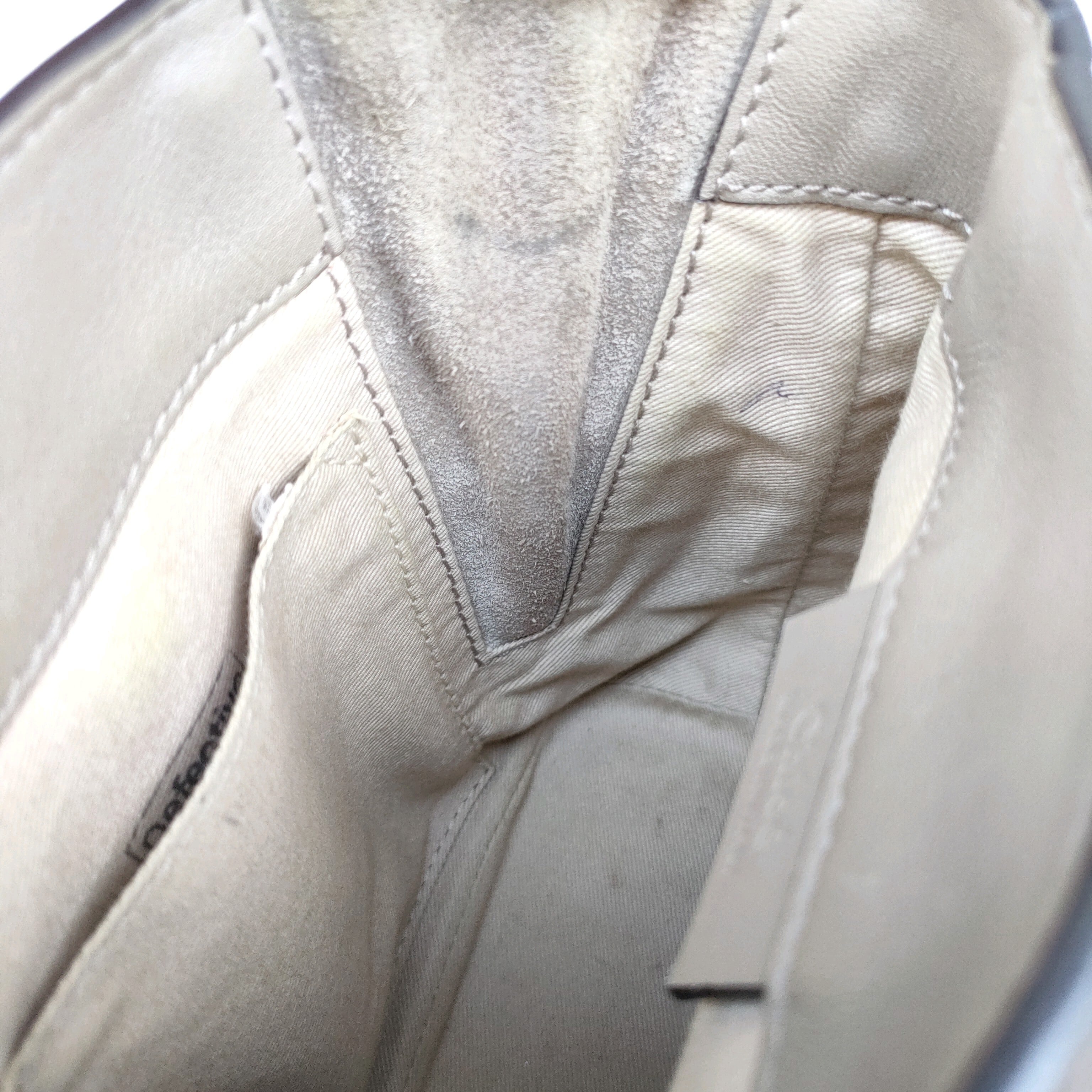 ★フラップが当たる部分のレザー擦れ、フラップのスウェードに薄汚れ、内側に細かいペン跡など一部に使用感がございます。