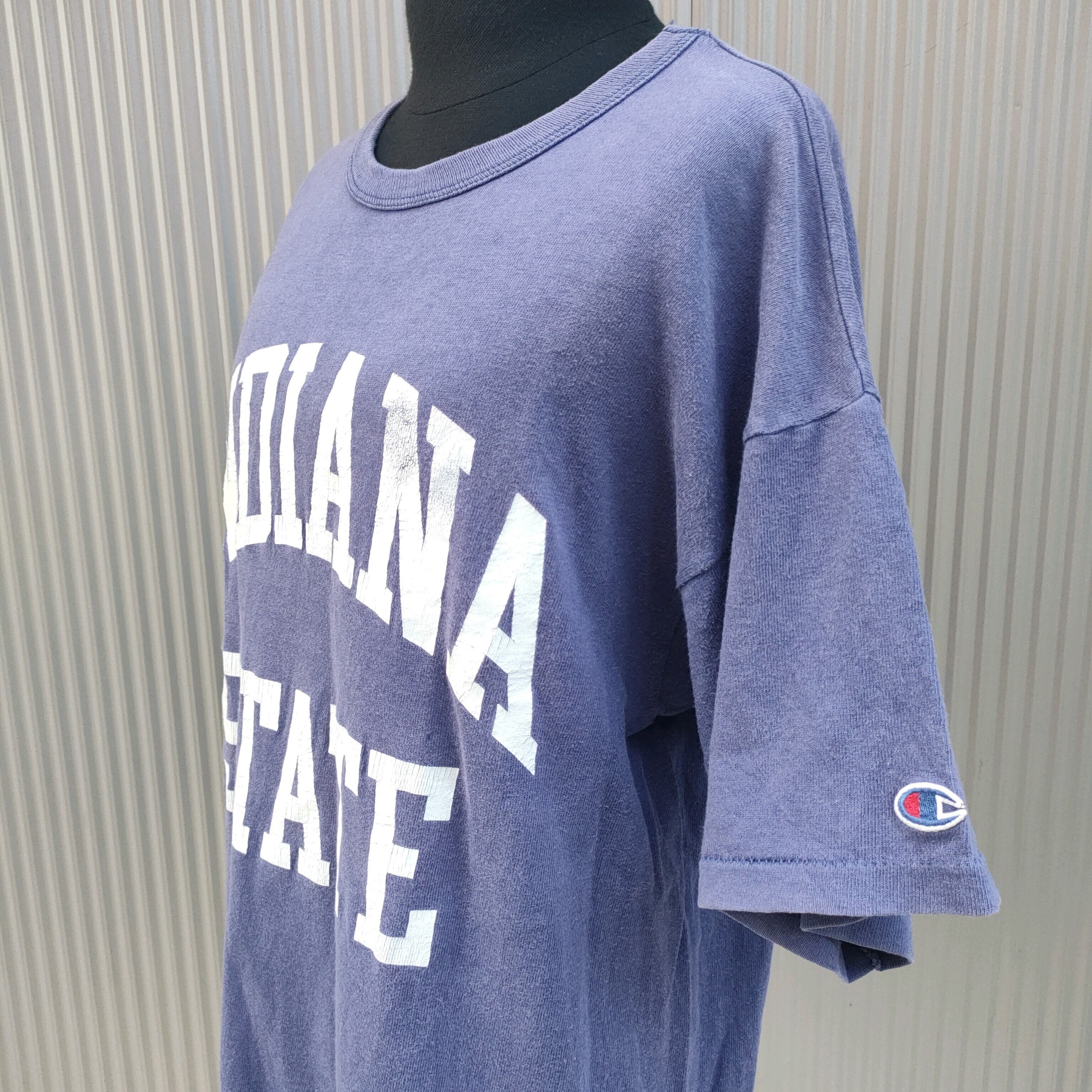 ○【80s】チャンピオンchampion/ビンテージ/ヴィンテージ/アメリカ古着/トリコタグ/INDIANA STATE/2段プリント/アーチロゴ/カレッジTシャツ/L/ネイビー/茄子紺/R0630NSF2/0052/