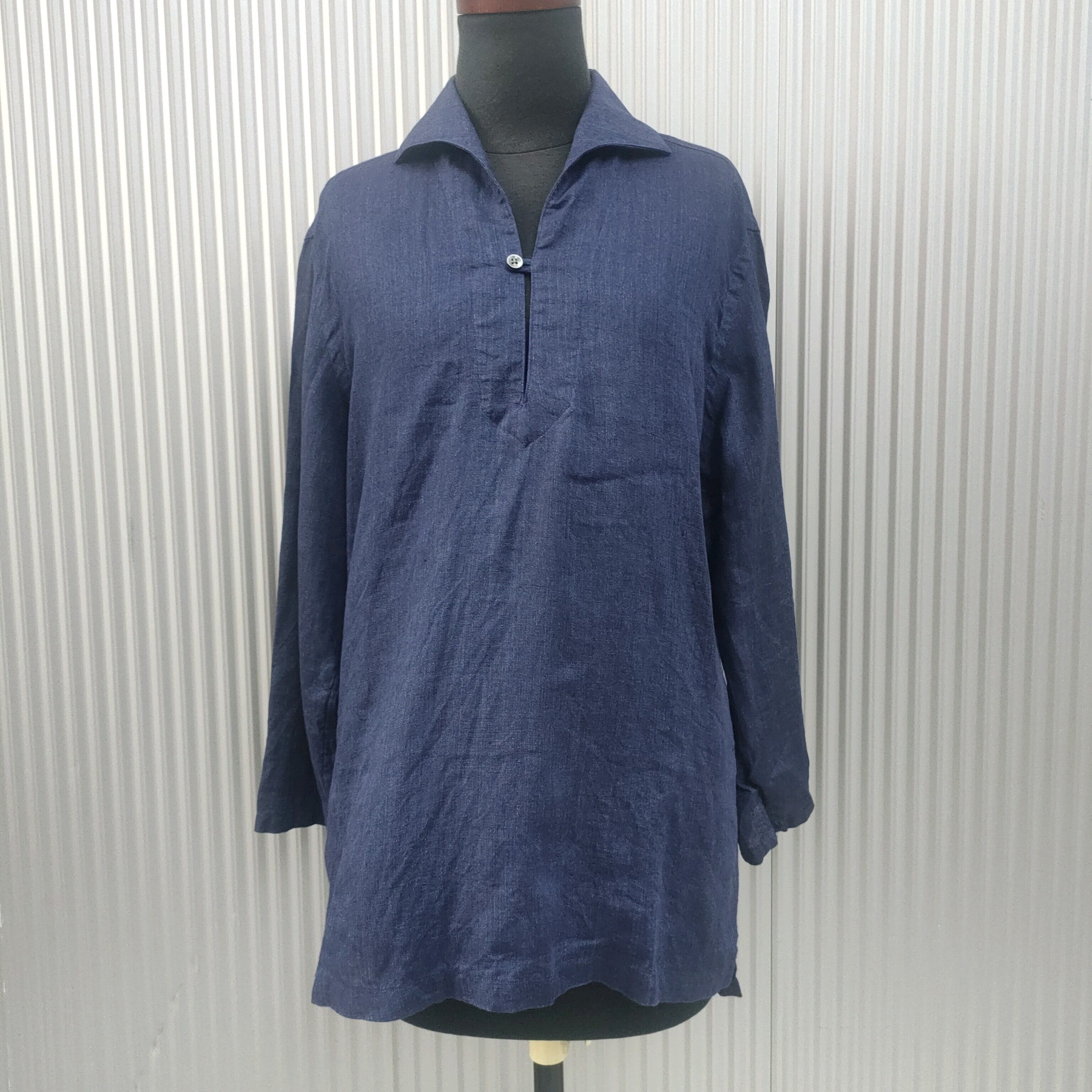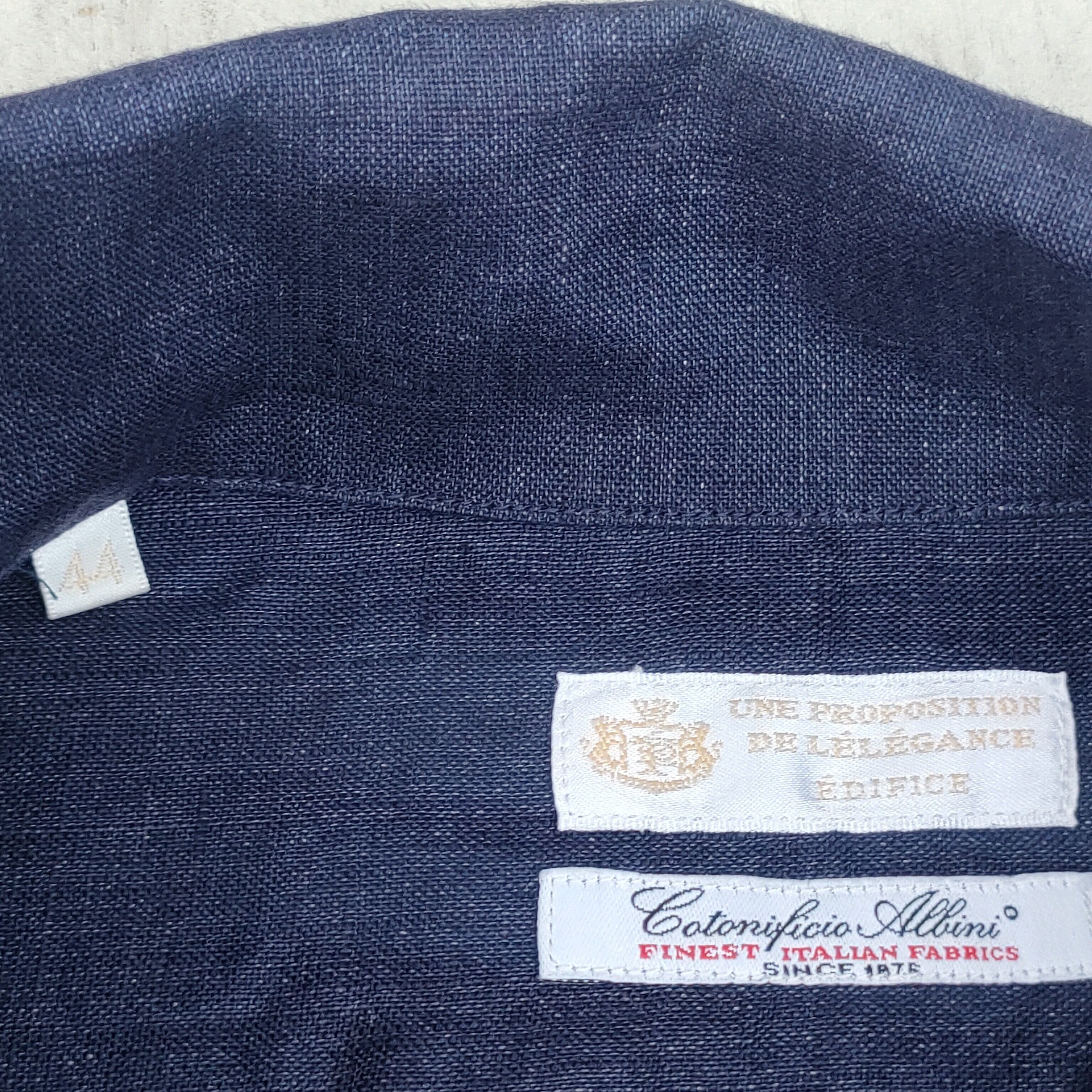 △【別注】美品/エディフィスEDIFICE × アルビニAlbini/襟芯/麻/リネン/7分袖/スキッパーシャツ/44/ネイビー/インディゴ/S062911/007/