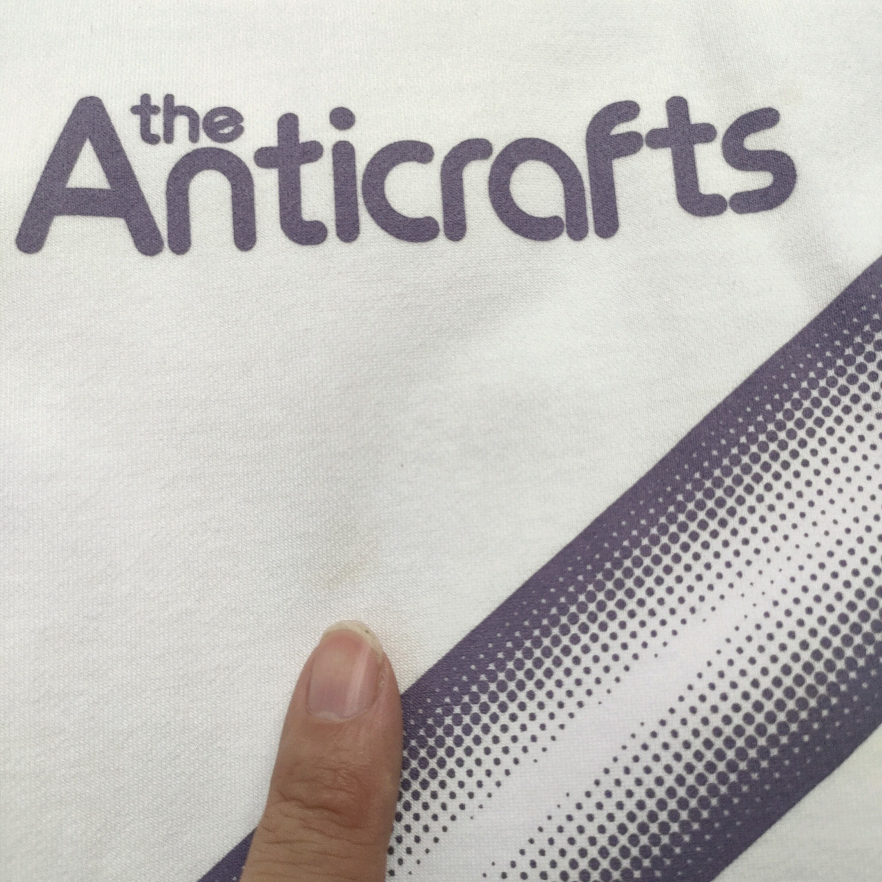 ★白にしては良好ですが古いものなので脇下に染み、Kの斜め下に赤系の薄汚れ、Anticraftsの下に薄汚れなど所々使用感がございます。(画像参照)