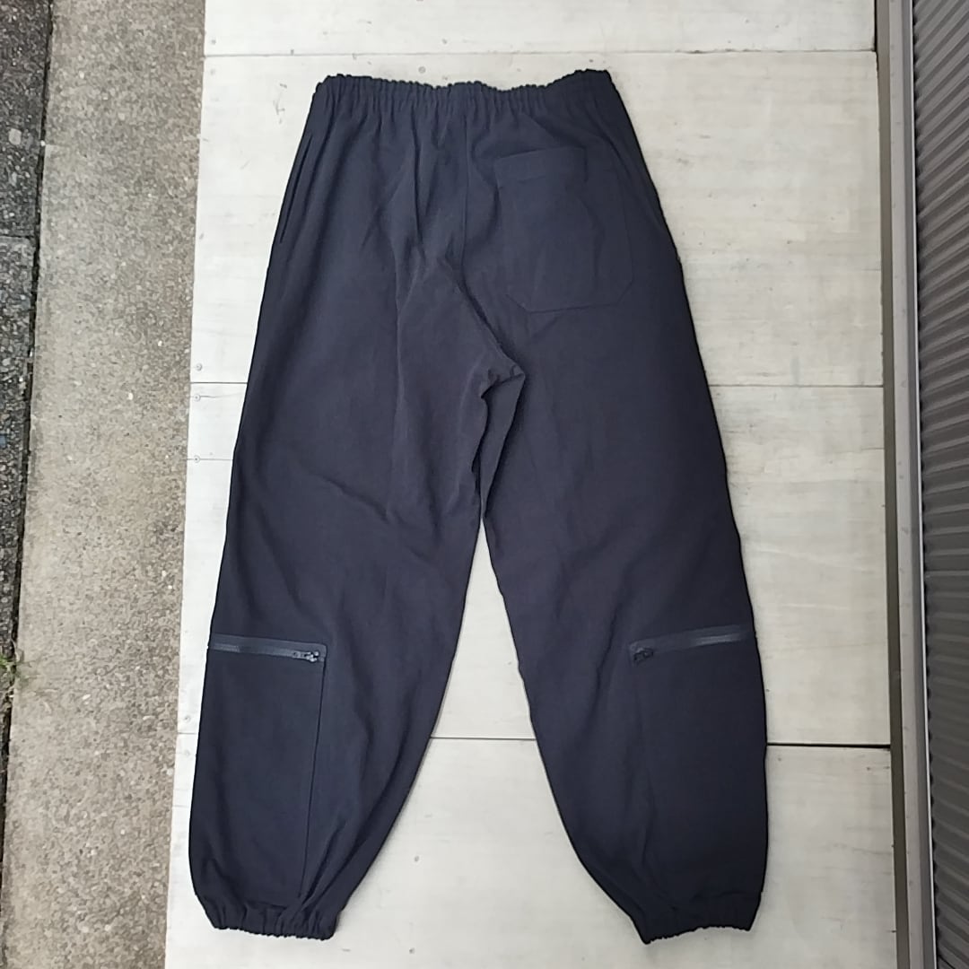 ★強撚サテン生地のファスナー付きパンツ。生地を繰り返し揉み込むことでヴィンテージの様な独特な風合いと膨らみを表現しています。ファスナー付きのポケットがランダムにデザインされています。ユニセックスでお召しいただけます。